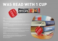 | Description | A typical mistake made by students is to fall asleep while reading a book. Nescafe 3in1 Xtra Strong is so powerful you can read half of a book with one cup only. How to prove it? Students often leave their special bookmarks in library books (e.g. tickets, wrappings from chocolate bars, chewing gums, candies, etc.). The next students that use these books find such bookmarks and use them with pleasure as they appears to be a present from an unknown person. Realization: Before to lend out a book the librarian inserted into it our bookmark, an empty coffee stick with the message “WAS READ WITH ONE CUP” on it. A student found another's bookmark in the middle of the book and thus received our message as if left by another student who had already read that book. |