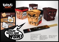 | Description | The idea is a comic interpretation of kung fu fight, where each client of Kung-Fu Kitchen is a warrior. Noodle box is the head of the enemy. You win in the battle by eating the contents. Your weapon - nun chuck for food. You call your enemy to fight: Longwei - Chinese monk, the Dragon warrior (rice noodles); Buck M. Heat - African-American master from Bronx (buckwheat noodles); Mario Maccarone - Italian Champion (egg noodles) . The first blow - reveal the skull. Second - eat the brain. Third - the enemy is defeated and begs for mercy! Fully enjoy the victory! |