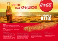 | Описание | Задача: поддержать рекламную акцию Coca-Cola «Открой лето» в торговом центре «Караван» с розыгрышем главного приза – поездки на море. Идея: дать участникам возможность почувствовать себя на море прямо сейчас Решение: Интерактивная площадка – пляж, который находится в большой трехметровой крышке Coca-Cola. «Пляж под крышкой» разместился прямо внутри торгового зала. Участники делились «приветом с моря» со своими друзьями. |