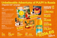 | Описание | Pulpy – молодёжный сокосодержащий напиток с натуральной цельной мякотью апельсина! Об этом продукте должны знать все и всюду! Поэтому мы отправили его в кругосветное путешествие – 360° за 365 дней! Обилие каналов и сочные решения на TV, радио и в интернете! Яркие приключения Pulpy по всей стране – вузы, пляжи, торговые точки – в компании с двухмиллионной молодой аудиторией в 23 городах! Стерео-варио, плазмы, фотобудки, и настоящий робот-апельсин заразили своим «вирусом» 600 тысяч человек! В результате путешествия показатели взмыли ввысь, а натуральную мякоть Pulpy узнали и полюбили палпиллионы потребителей по всей России! |