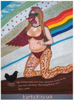 | Опис | "Курка" - это обычная сельская курочка: живёт на ферме, гуляет по травке, ест пшено, разговаривает в Фейсбуке на простонародном говоре под названием "суржик". А ещё, как и все селяне, отличается нетерпимостью по отношению ко всему противоестественному - геям, бодибилдерам, женщинам с "пластикой". Этим её качествам - натуральности и нелюбви к ненатуральному - мы посвятили рекламные картины. Такие же настоящие, как и сама Курка: на холсте, акрилом, без фотошопа. Автор - художник Иван Семесюк. "Муклокура". Любите всяке накачене ГМО? Не їжте ГМО, їжте натуральну Курку. |